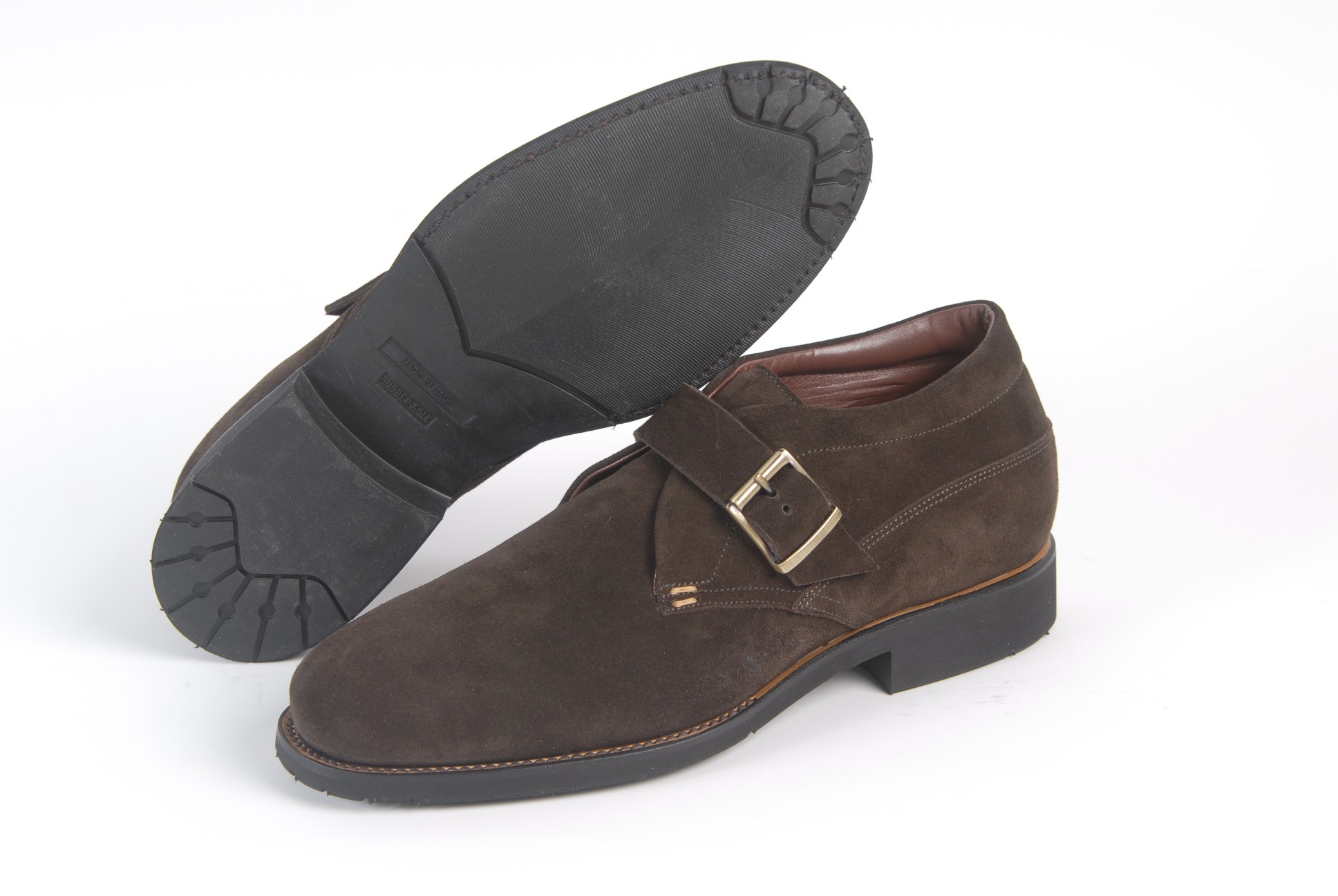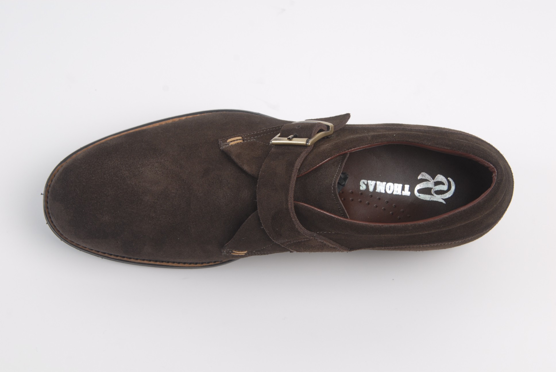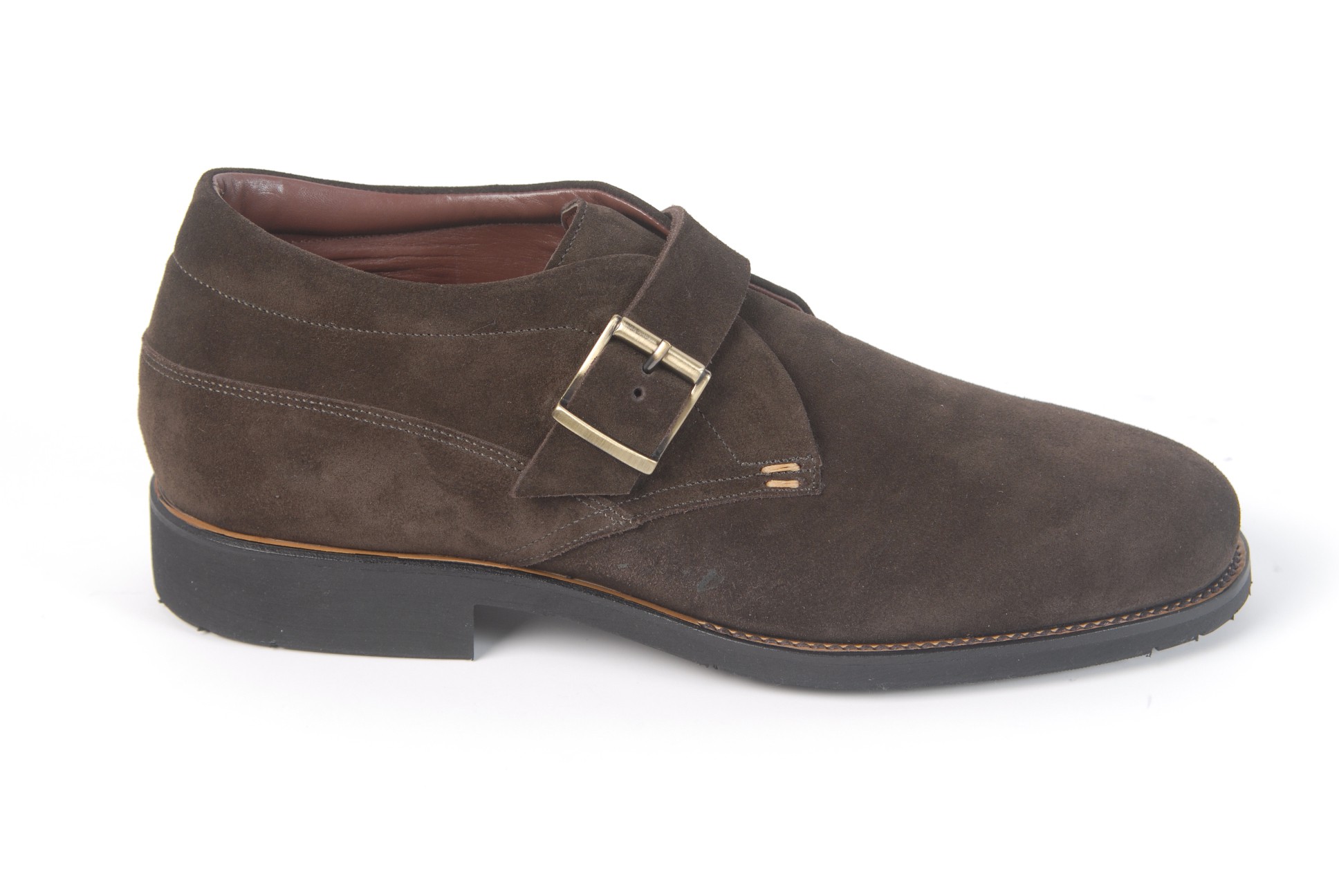 Calzatura artigianale uomo di colore marrone con accessorio fibbia.
